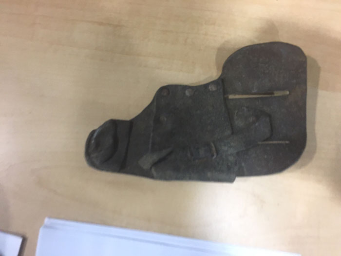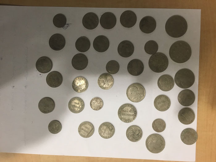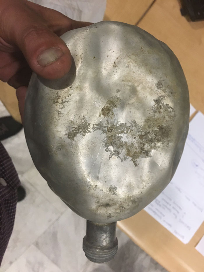 Αλουμινένιο παγούρι, περιείχε 47 δραχμές του 1926, 2 χρυσές λίρες και μία δερμάτινη θήκη πιστολιού.