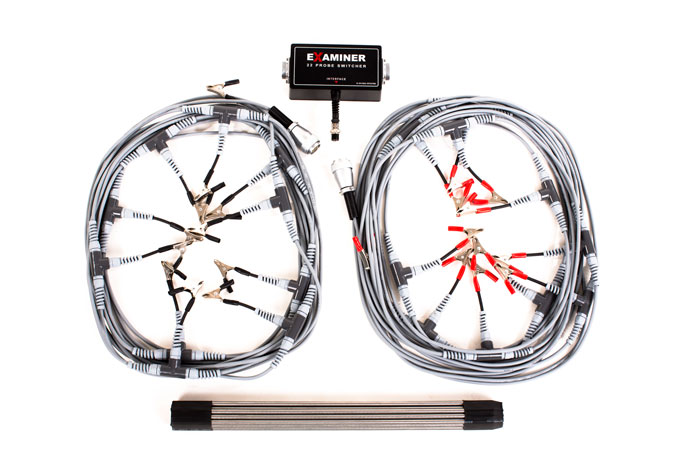 Για να λειτουργήσουμε το Geo Examiner με τις 22 γειώσεις απαιτείται η αγορά του προαιρετικού εξοπλισμού της μονάδας 22 γειώσεων και των 2 καλωδίων της, όπως φαίνονται στην εικόνα. Αφού επιλέξουμε στο μενού “22 ΓΕΙΩΣΕΙΣ” και πατήσουμε “ΞΕΚΙΝΗΜΑ” το Geo Examiner συλλέγει μέσα σε 20 δευτερόλεπτα και απεικονίζει αυτόματα, δεδομένα από τις 2 πολύκλωνες καλωδιώσεις των 11 γειώσεων η καθεμία. Με τη λειτουργία 22 γειώσεων λαμβάνουμε δεδομένα από πολλά σημεία μέτρησης, έτσι αυξάνεται η ανάλυση της εικόνας και επιταχύνεται η έρευνα. Συγκριτικά οι γεωφυσικοί ανιχνευτές με 4 γειώσεις απαιτούν περισσότερο χρόνο για τη σάρωση του σημείου, και δεν μπορούν να παρουσιάσουν αντίστοιχο γράφημα μεγάλης ακριβείας. Η δυνατότητα έρευνας με πολλές γειώσεις ταυτόχρονα βρίσκεται σε ακριβότερα και ποιο δύσχρηστα μηχανήματα από το Geo Examiner..