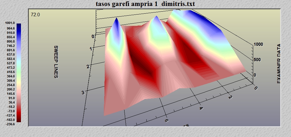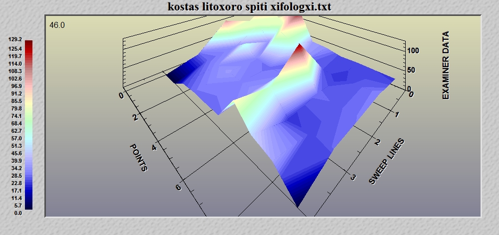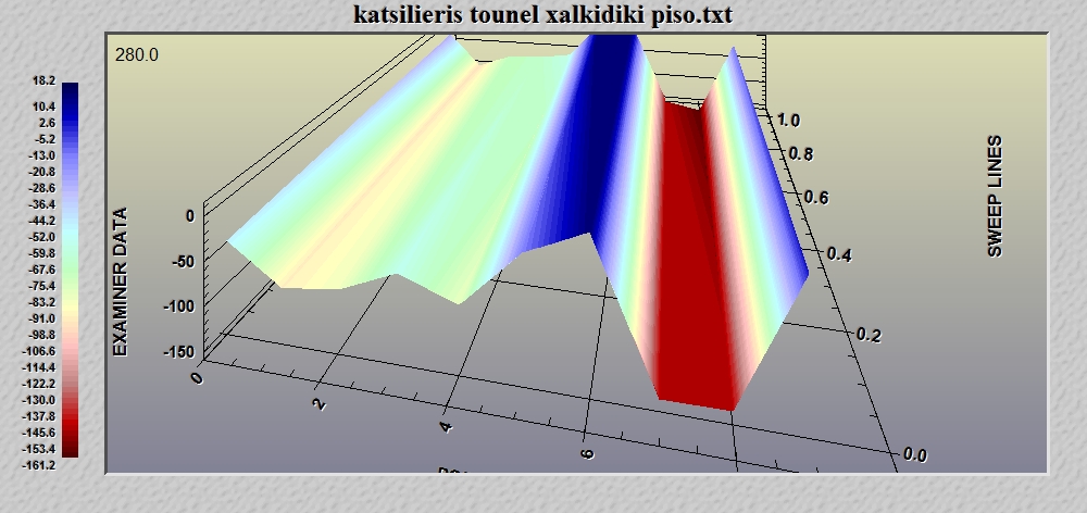 Δεν χρειάζεται να γίνει πρώτα η έρευνα – καταγραφή και κατόπιν να αποσταλούν τα δεδομένα στον υπολογιστή για να εμφανιστεί το γράφημα. Η απεικόνιση στο GEO EXAMINER παράγεται στον υπολογιστή άμεσα, ενώ μετακινούνται οι γειώσεις, ή βαδίζοντας με το μαγνητόμετρο και τον ανιχνευτή μετάλλου. Το πρόγραμμα έχει και επιλογή φιλτραρίσματος του στόχου από εδαφικά μεταλλεύματα για τους ποιο έμπειρους.