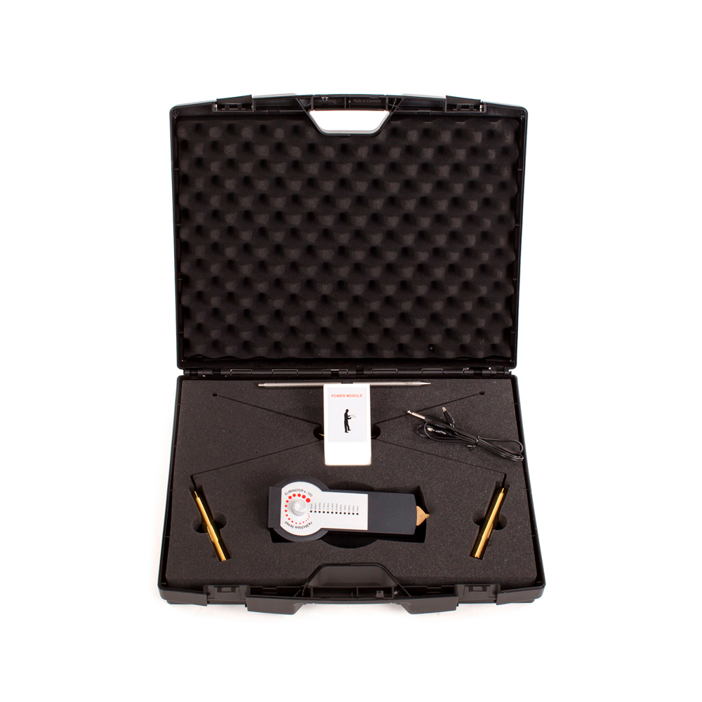 Επιχρυσωμένες βέργες ραβδοσκοπίας Γ, ενισχυτή σήματος για τις βέργες ραβδοσκοπίας με καλώδιο “Υ”, Eliminator e-120 B με επιλογή ανιχνευτή γεννήτριας συχνοτήτων ή φίλτρου απόρριψης μεταλλεύματος εδάφους & μικρών στόχων, μπαταρίες 9 volt, βαλιτσάκι μεταφοράς, οδηγίες χρήσης στα Ελληνικά. Καλύπτεται από διετή εγγύηση.