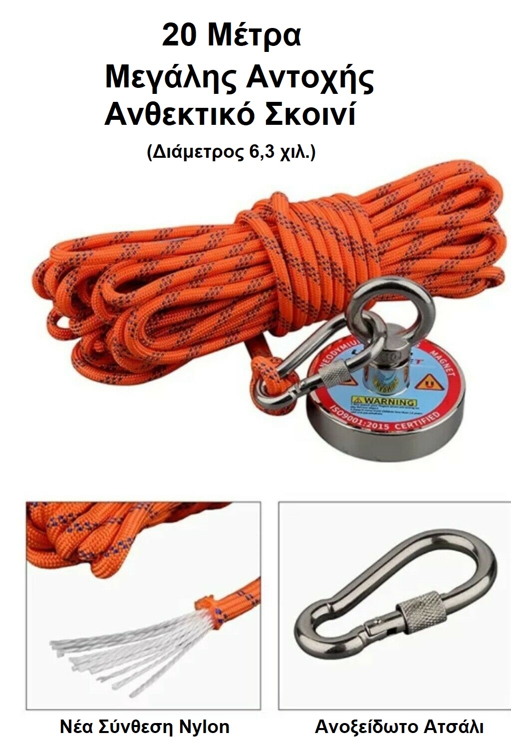 – Είναι σχεδιασμένο για βαριά και υποβρύχια χρήση με ανθεκτικό συνθετικό σκοινί που βοηθά στην ανάκτηση χαμένου εξοπλισμού, εργαλείων, εργαλείων ψαρέματος και άλλων σιδηρούχων αντικειμένων σε βαθιά νερά, πηγάδια, τρύπες. Είναι επίσης εξαιρετικός για μαγνητική ανύψωση και κρεμαστές εφαρμογές.
