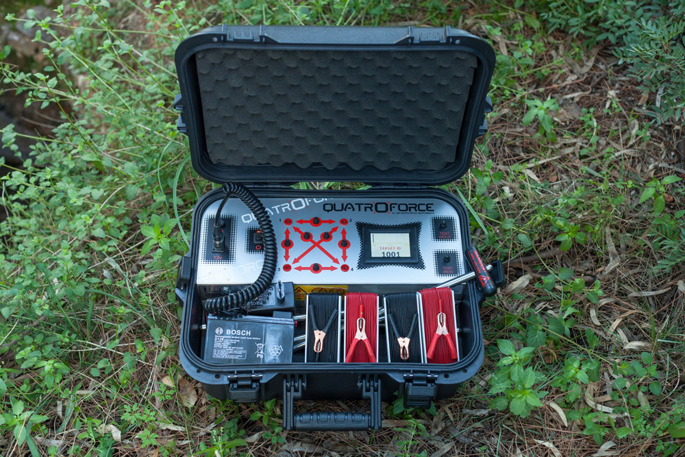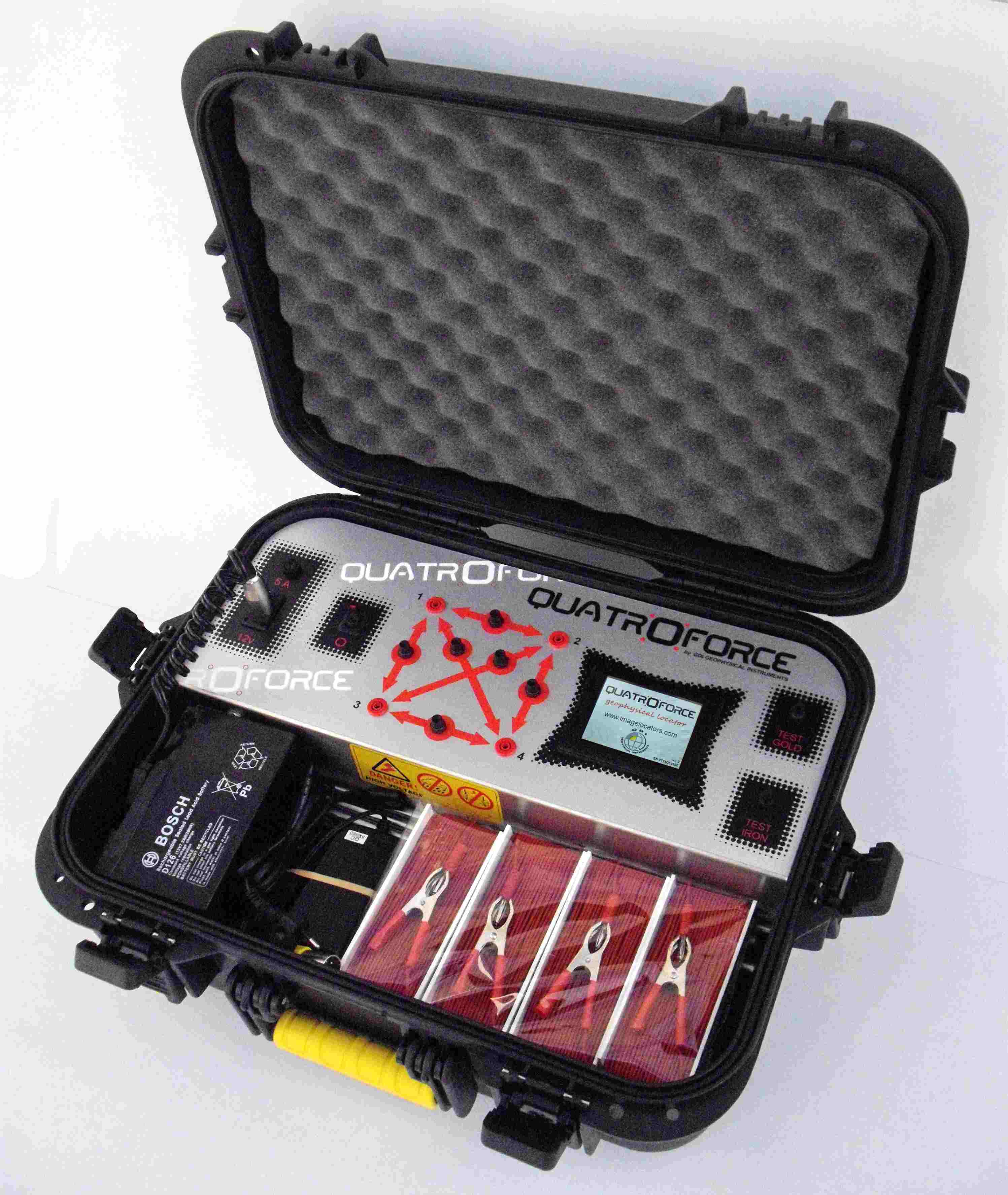 Το QUATROFORCE είναι γεωφυσικός ανιχνευτής για ανίχνευση θησαυρών, χρυσού, μετάλλων, μεταλλευμάτων, σπηλαίων, τούνελ, κενά εδάφους, νερό κτλ. Το QUATROFORCE παράγει ένα δυνατό ηλεκτρικό σήμα και μετράει τη συνολική ηλεκτρική αντίσταση του εδάφους μεταξύ των 4 γειώσεων που διαθέτει, τις οποίες τοποθετούμε σε τετράγωνη ή ορθογώνια διάταξη. Οι μετρήσεις παρουσιάζονται σε ένα έγχρωμο LCD με γραφικά και βαθμό αναγνώρισης στόχου. Η ηλεκτρική αντίσταση του εδάφους αλλάζει με παράγοντες όπως νερό, μέταλλα ή σπηλιές. Η οθόνη του QUATROFORCE κατατάσσει τους στόχους σε κατηγορίες : χρυσού, ασήμι, χαλκό, σίδερο, μεταλλεύματα, νερό, κενά εδάφους, σπηλιές & τούνελ.