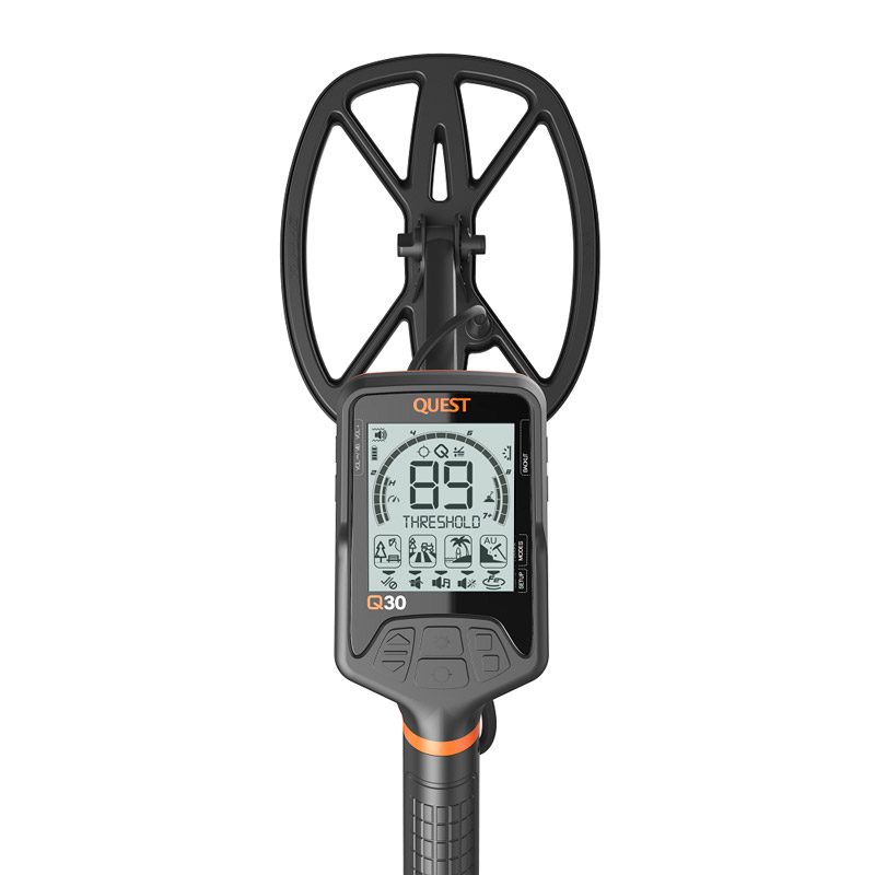 Οι ανιχνευτές μετάλλων QUEST Q30 παρέχουν οθόνη LCD με 2 επίπεδα φωτισμού, η οποία παρουσιάζει στο χειριστή πληροφορίες για το στόχο και παραμέτρους της έρευνας, τα οποία μέχρι σήμερα προσέφεραν μόνον ανιχνευτές μετάλλων με πολύ ακριβότερη τιμή.