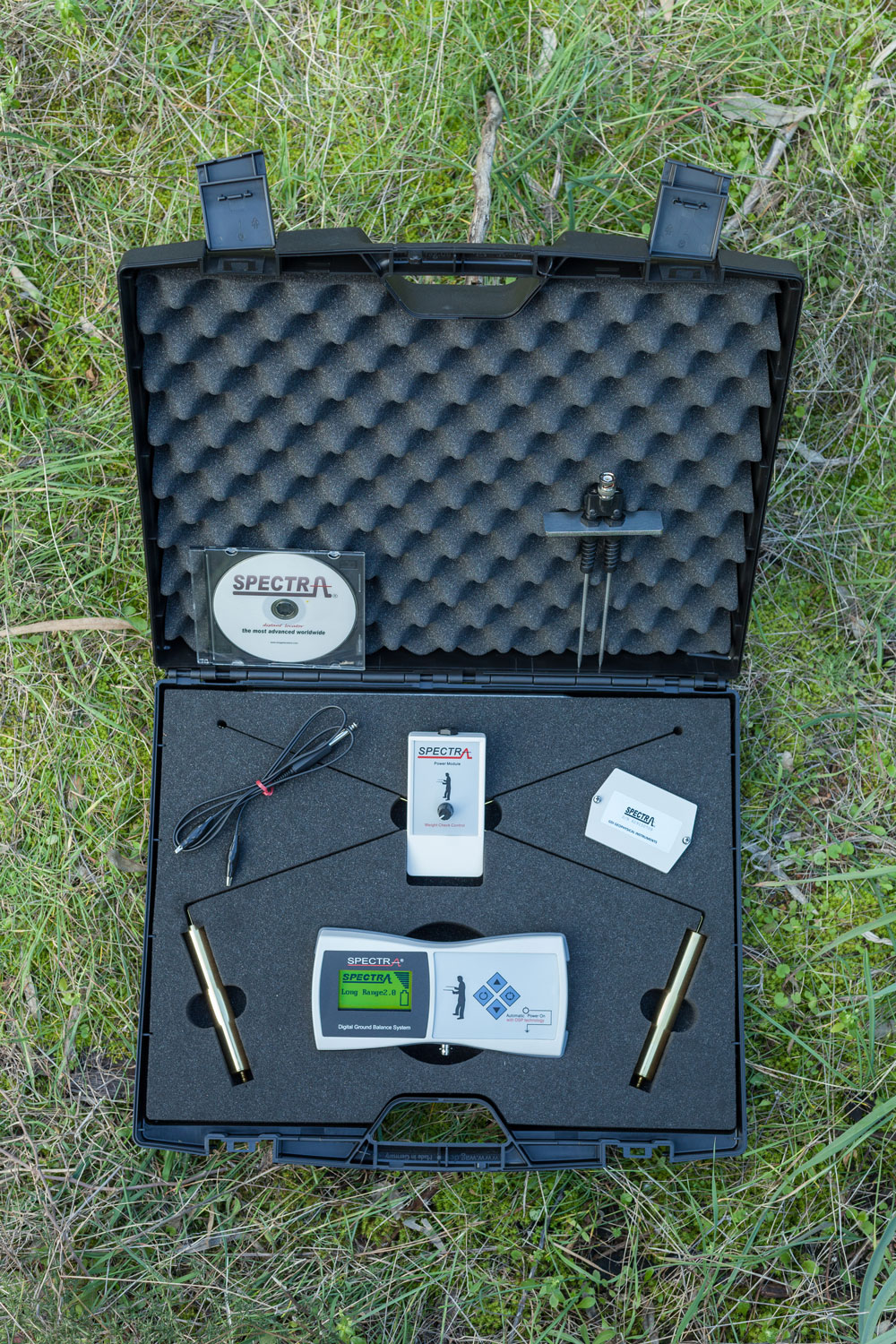 Μετά πολλά έτη πειραματισμού με διάφορες συσκευές, εξελίξαμε αυτό το μικρό και ενισχυμένο πομπό SPECTRA, ικανό να εκπέμπει ράδιο-συχνότητες (RF) με σταθερότητα 0,1Hz, αρκετή ώστε να διεγείρουν μόνον τα επιθυμητά στοιχεία. Αυτή η σταθερότητα στο σήμα της συχνότητας παράγεται από ένα τεχνολογικά εξελιγμένο μικροτσίπ DSP ταχύτητας 40 MIPS ( MIPS = million intsructions per second ) μέσα στο SPECTRA. Το σήμα αποστέλλεται μέσω του εδάφους σε μεγάλες αποστάσεις με διαφορετικές κυματομορφές (παλμούς), που φιλτράρουν τις παρεμβολές απο τα μεταλλεύματα της περιοχής που ερευνάται. Το σήμα εκπέμπεται στο χώμα προς όλες τις κατευθύνσεις. Εξαιτίας αυτής της εκπομπής γίνονται «ορατοί» οι στόχοι. Οι στόχοι μπορούν να ανιχνευθούν προς όλες τις κατευθύνσεις, και ο χειριστής δεν περιορίζεται να ανιχνεύσει προς μία συγκεκριμένη κατεύθυνση.