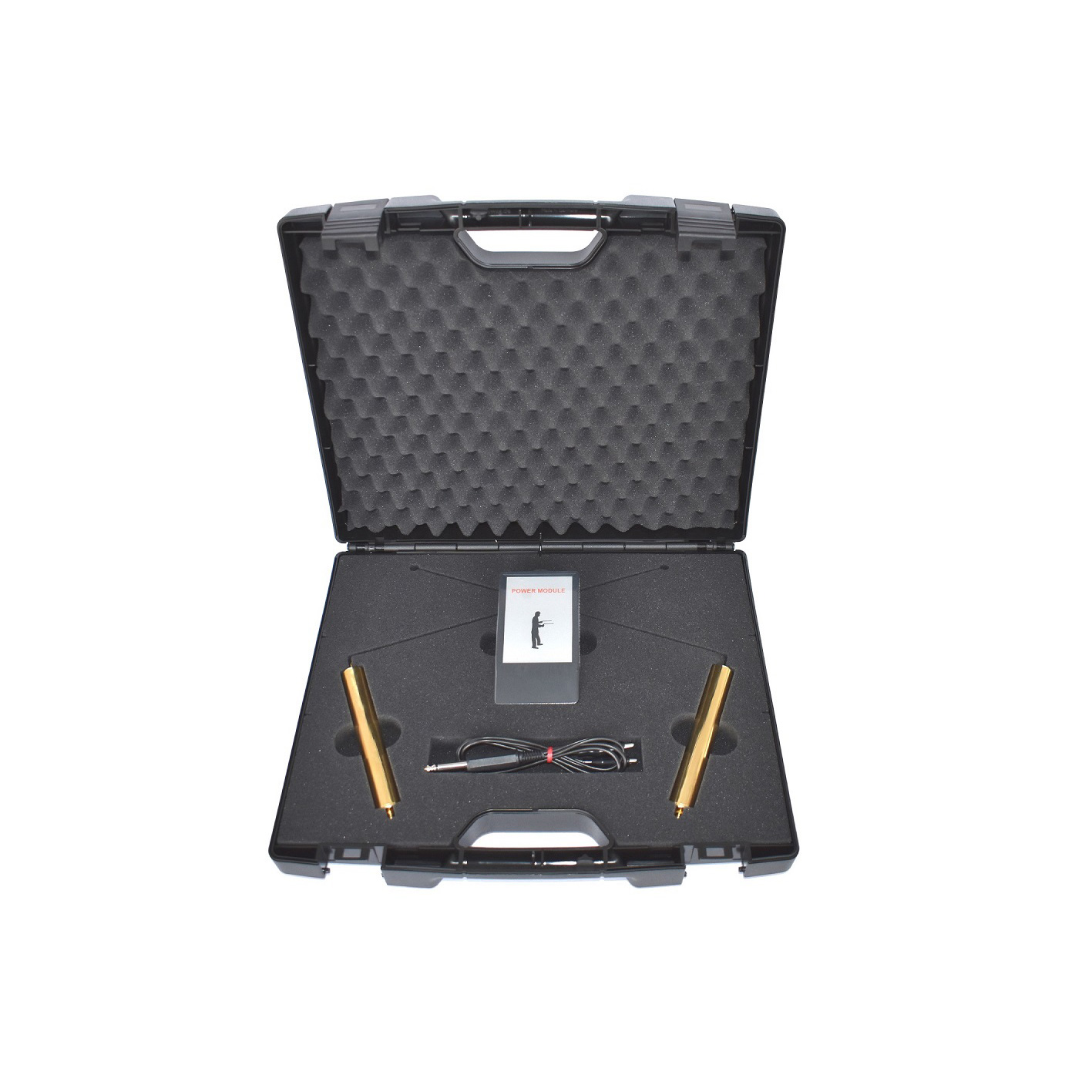 TELERODS τηλεσκοπικές βέργες ραβδοσκοπίας χρυσού-μετάλλων σχήματος Γ, οι οποίες περιλαμβάνουν ενισχυτή σήματος και βαλιτσάκι μεταφοράς με διαμερίσματα από αφρώδες υλικό.