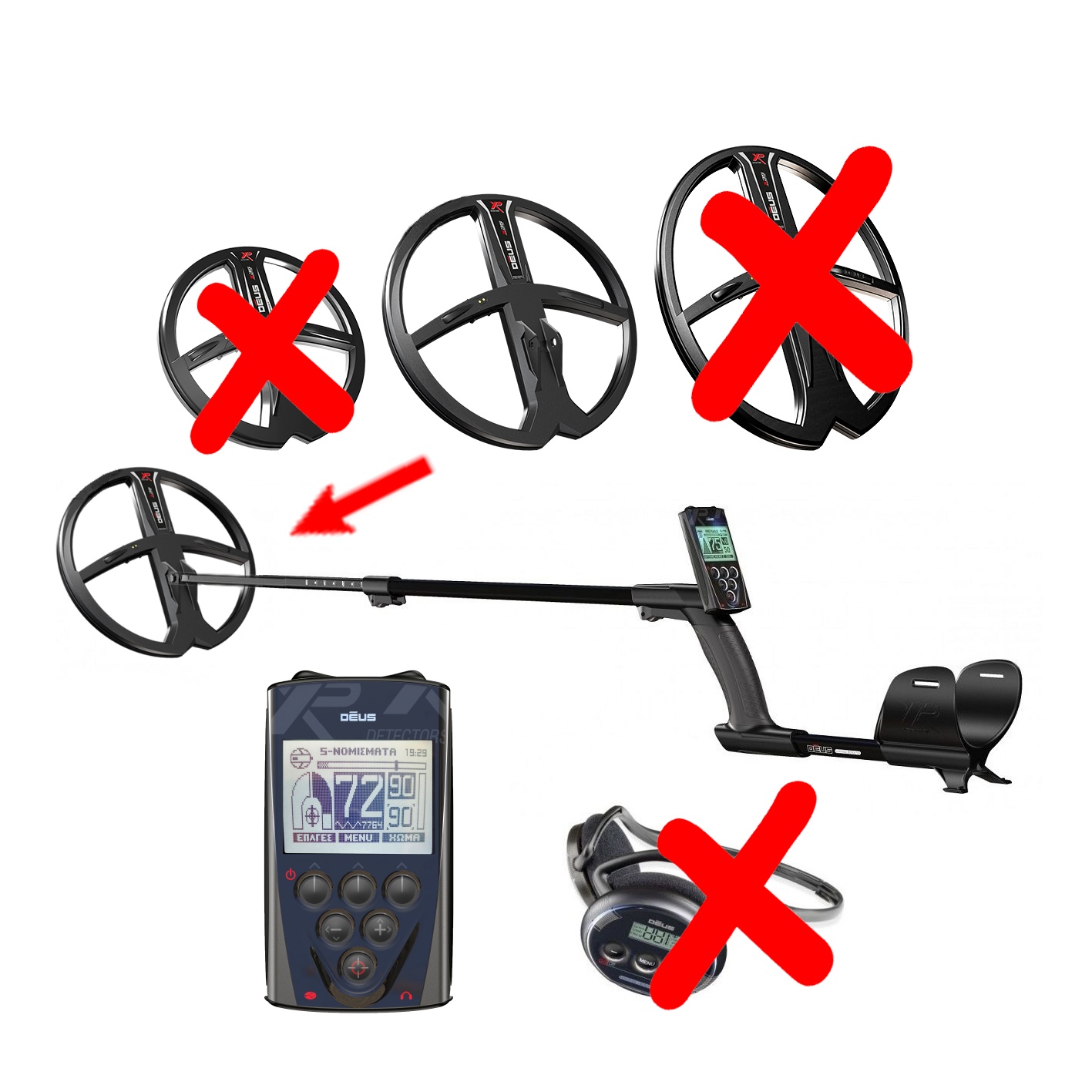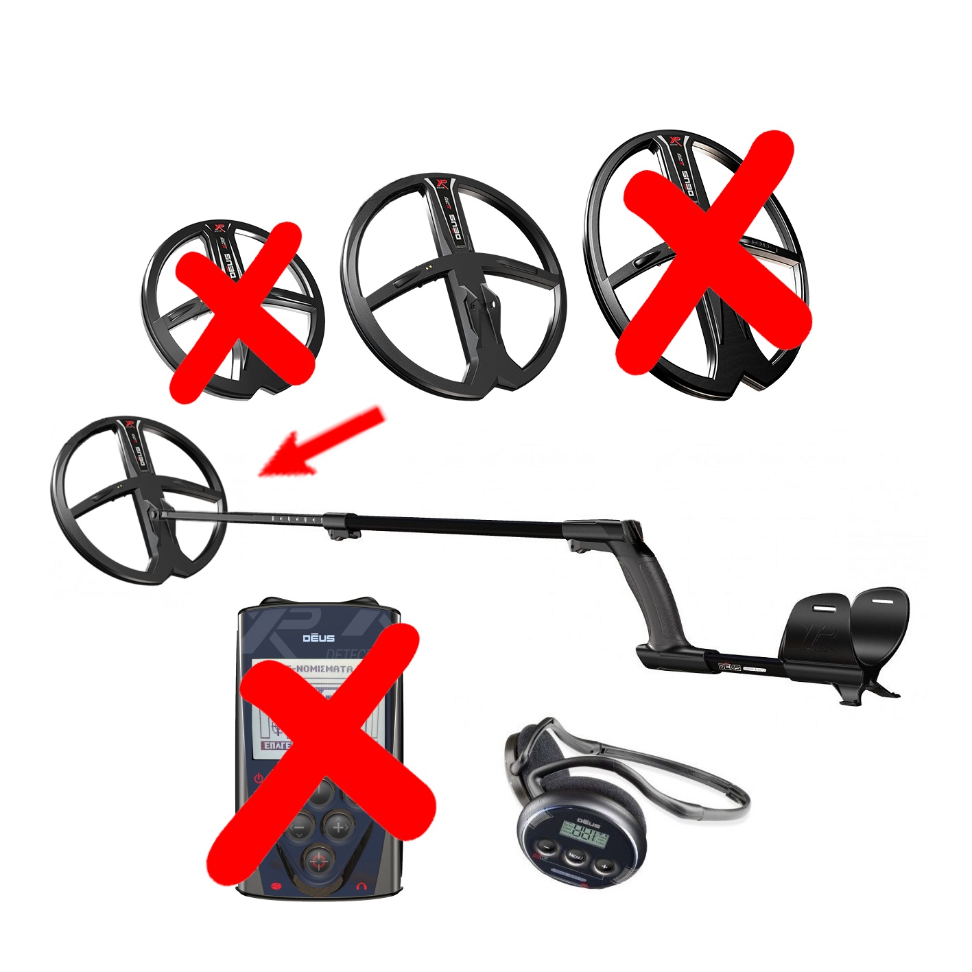 Η διαρρύθμιση του XP DEUS βασίζεται σε 3 στοιχεία: το δίσκο, το τηλεκοντρόλ, και το σετ ακουστικών, τα οποία είναι μοναδικά στο ότι επικοινωνούν μεταξύ τους με ψηφιακό ραδιοφωνικό σήμα.